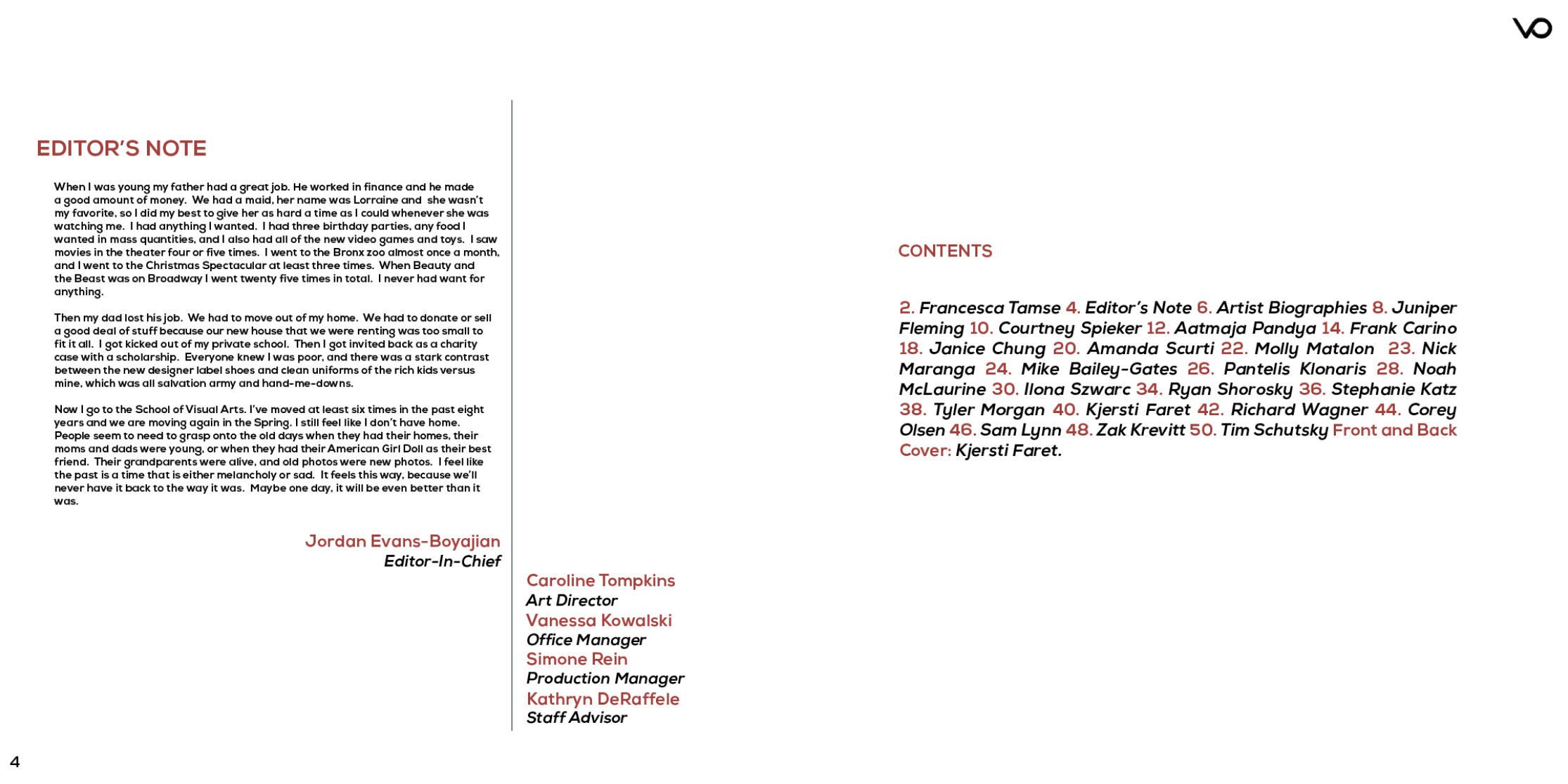 As Production Manager for Visual Opinion Magazine at School of Visual Arts, I was responsible for the design of the school's only student-run professional portfolio publication. I ultimately was promoted to Editor and continued to contribute in a design-based capacity. Here are example spreads. Full issues may be viewed here.